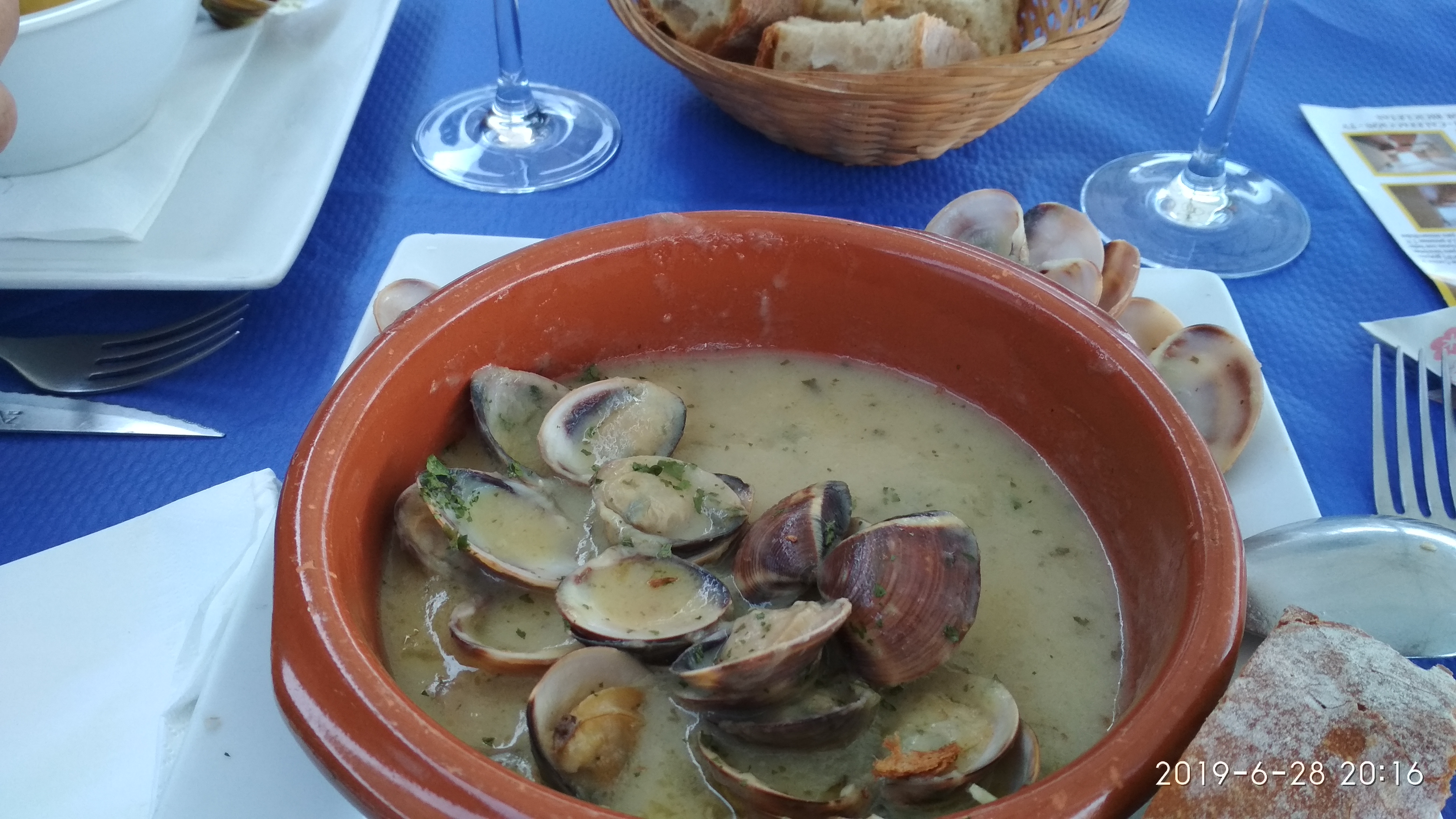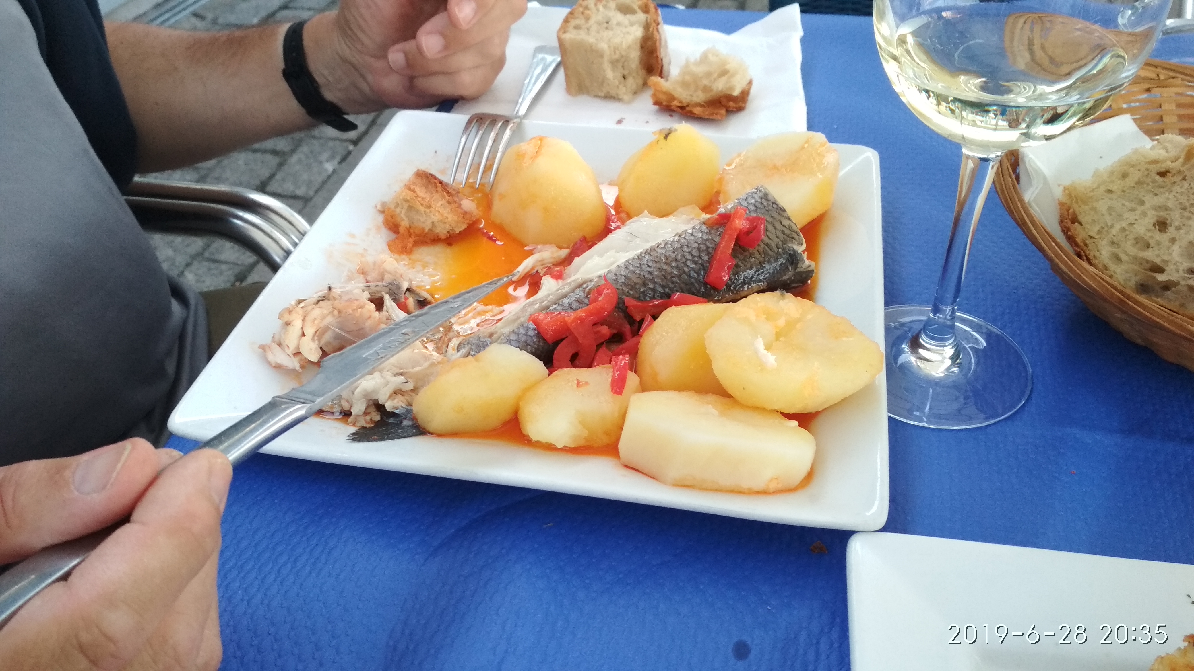 Nos sentamos en una terraza a tomarnos unas cervecitas y, teniendo en cuenta que tenía muy buena pinta lo que estaban poniendo de cenar a los extranjeros, aunque eran las 8 de la tarde, decidimos quedarnos allí a cenar. Tomamos una sopa de pescado y un buen trozo de lubina a la gallega, y un buen plato de almejas a la marinera y unos pescaditos fritos, respectivamente, todo ello bien servido y con el vino incluído. Pagamos unos 12 euros por menú.
