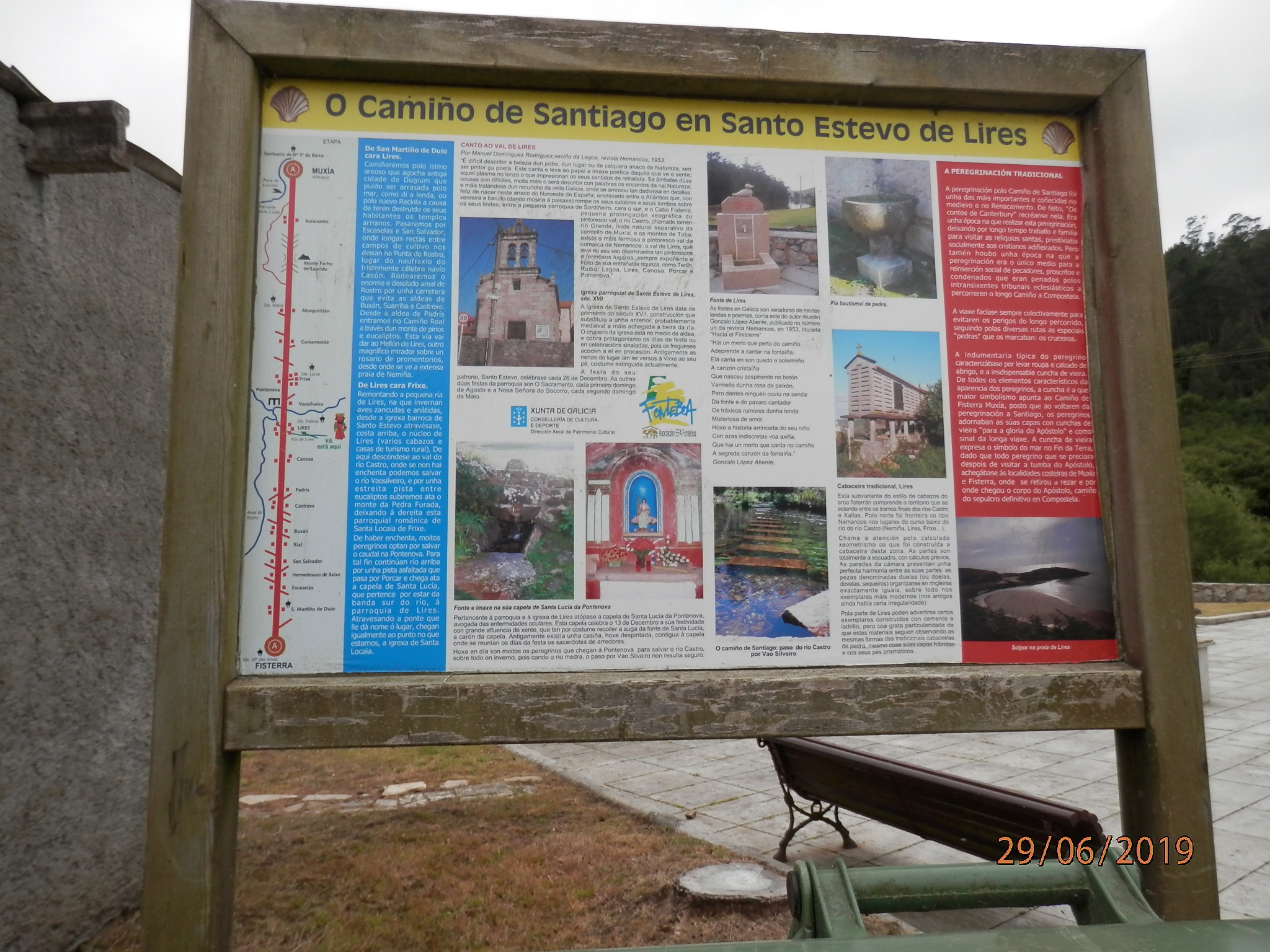 Llegado a Lires veo el templo de San Estevo y, sin encontrarme cansado, me desvío unos metros para sellar y tomar un almuerzo en un hotel-restaurante donde tienen 2 sellos muy curiosos. Yo no disponía más que de un hueco que reservaba para Muxía, así que los puse en un papel aparte. Dicen que debes sellar en Lires si quieres luego alojarte en el albergue municipal de Muxía. Total, un almuerzo y un descanso para los pies.