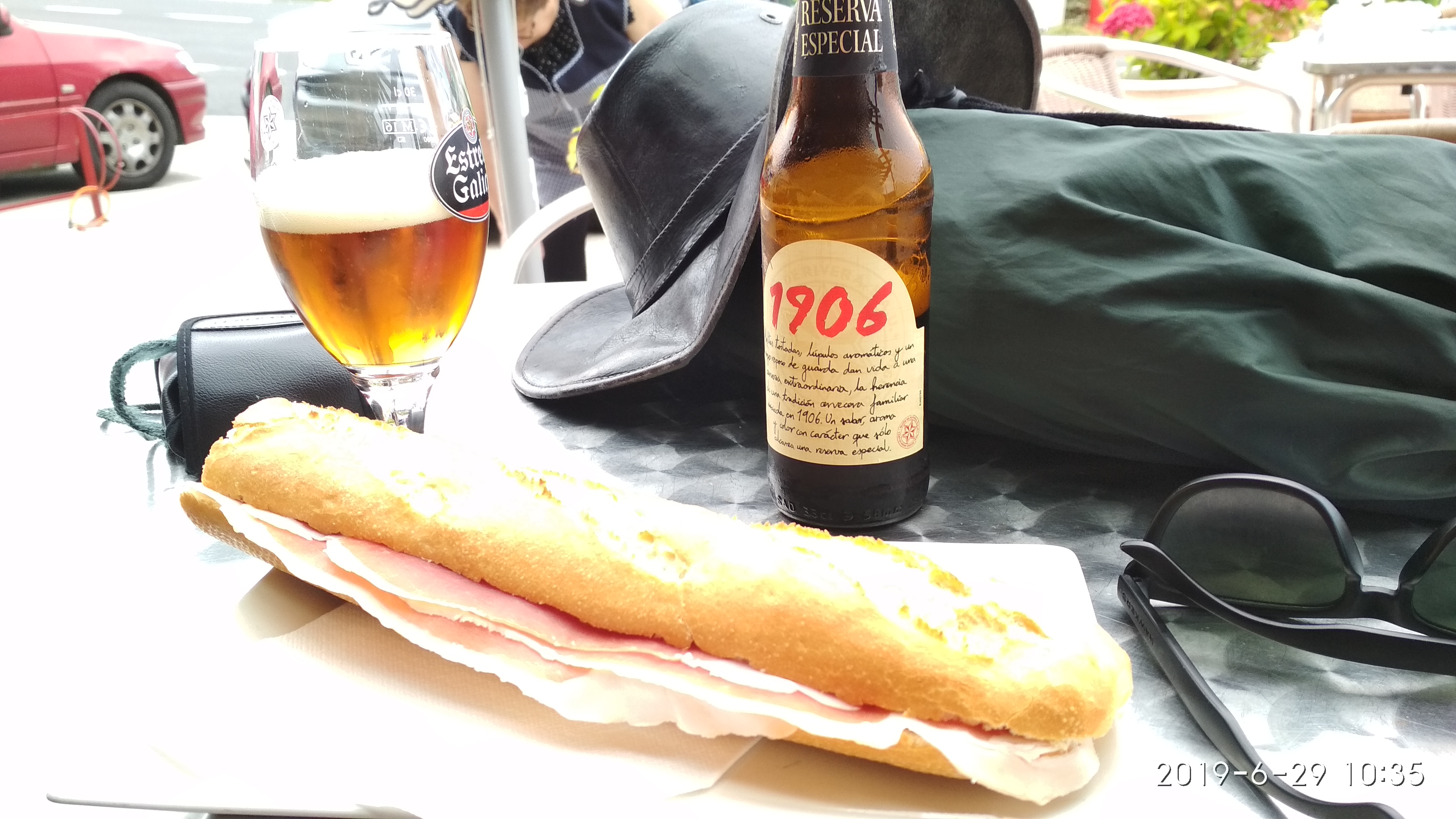 Llamo a Ángel para decirle que he hecho un alto en Lires, para comerme un bocadillo, mientras él llega a Muxía poco antes de las 12 horas. Antes que nada, él también se sienta en la terraza de un bar a tomarse una caña para reponer líquidos.