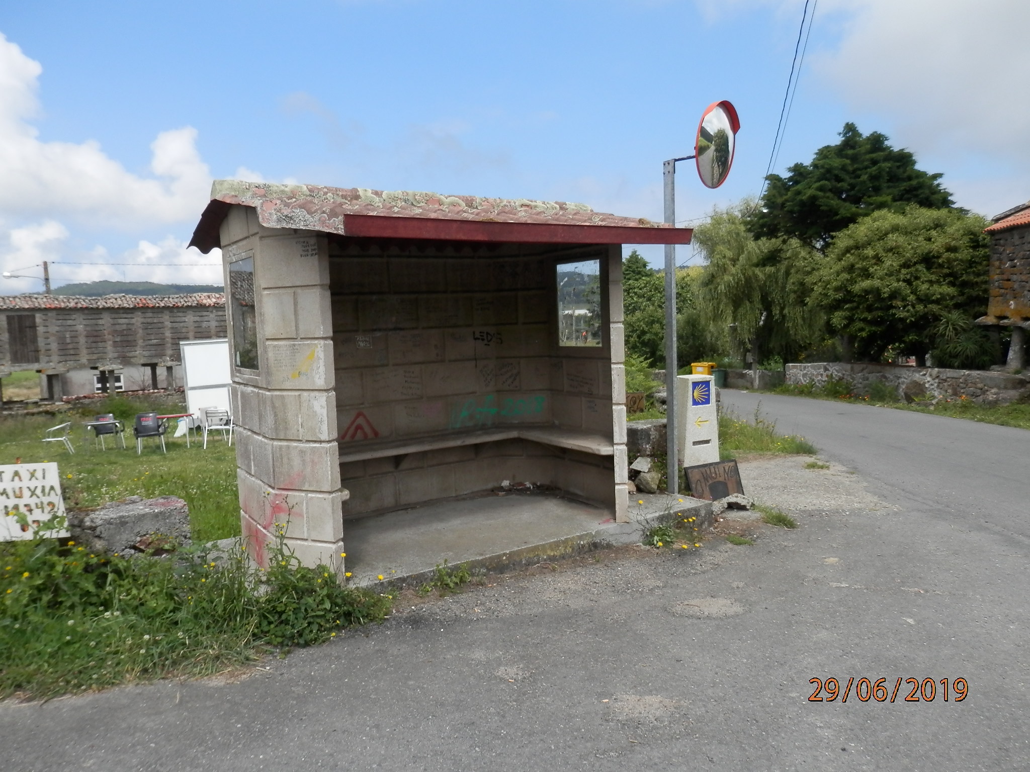 Alcanzo a ver y pasar a una joven alemana con la que mantengo una corta conversación pues iba demasiado despacio. También adelanto a un grupo de andariegos, que no peregrinos, justo al lado de unos molinos eólicos. Fotografío una especie de parada de autobús rural, en homenaje a Michel, que recordará los perros que se nos acercaron el año pasado cuando hicimos el trayecto inverso y nos refugiamos en este lugar para descansar y protegernos de la fuerte lluvia.