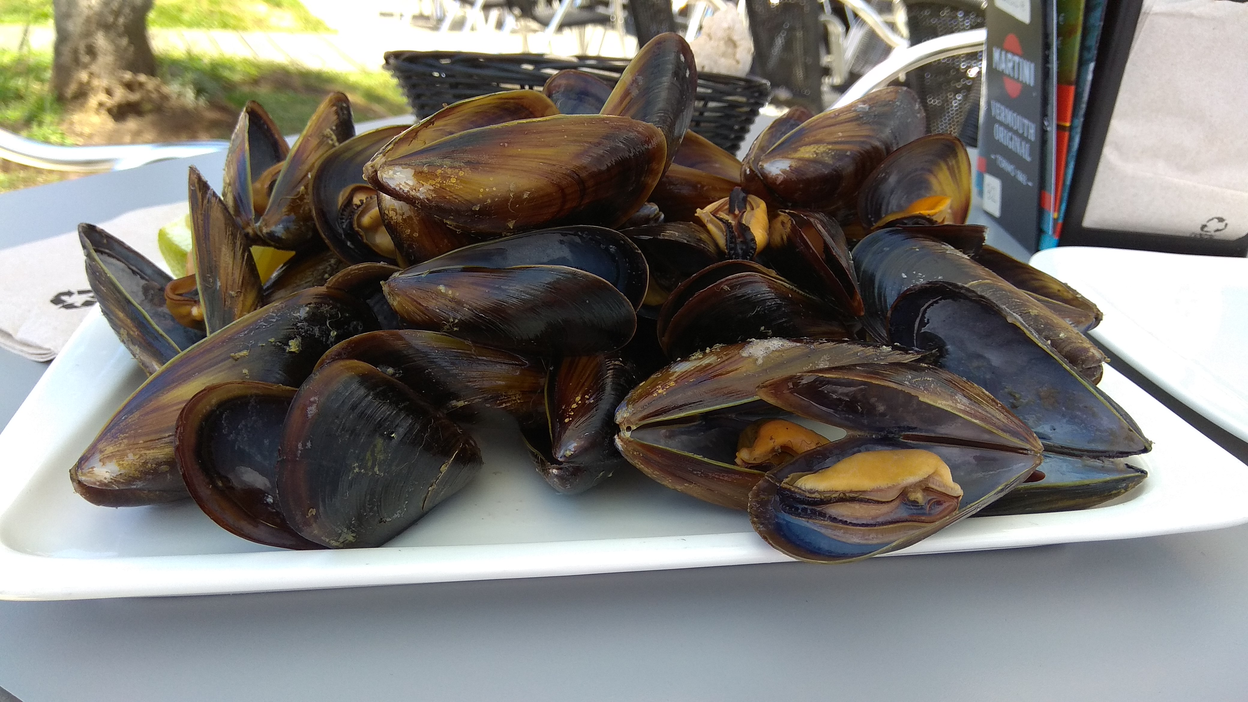 En esos momentos le mando un whatsapp diciendole que he terminado de bajar la cuesta pero que voy a parar un poco porque tengo los pies recalentados. Ángel se acerca hasta la zona del puerto a tomar unas cañas y se pide una ración de mejillones al vapor, qué consistía en un plato enorme, al precio de 5 euros.
