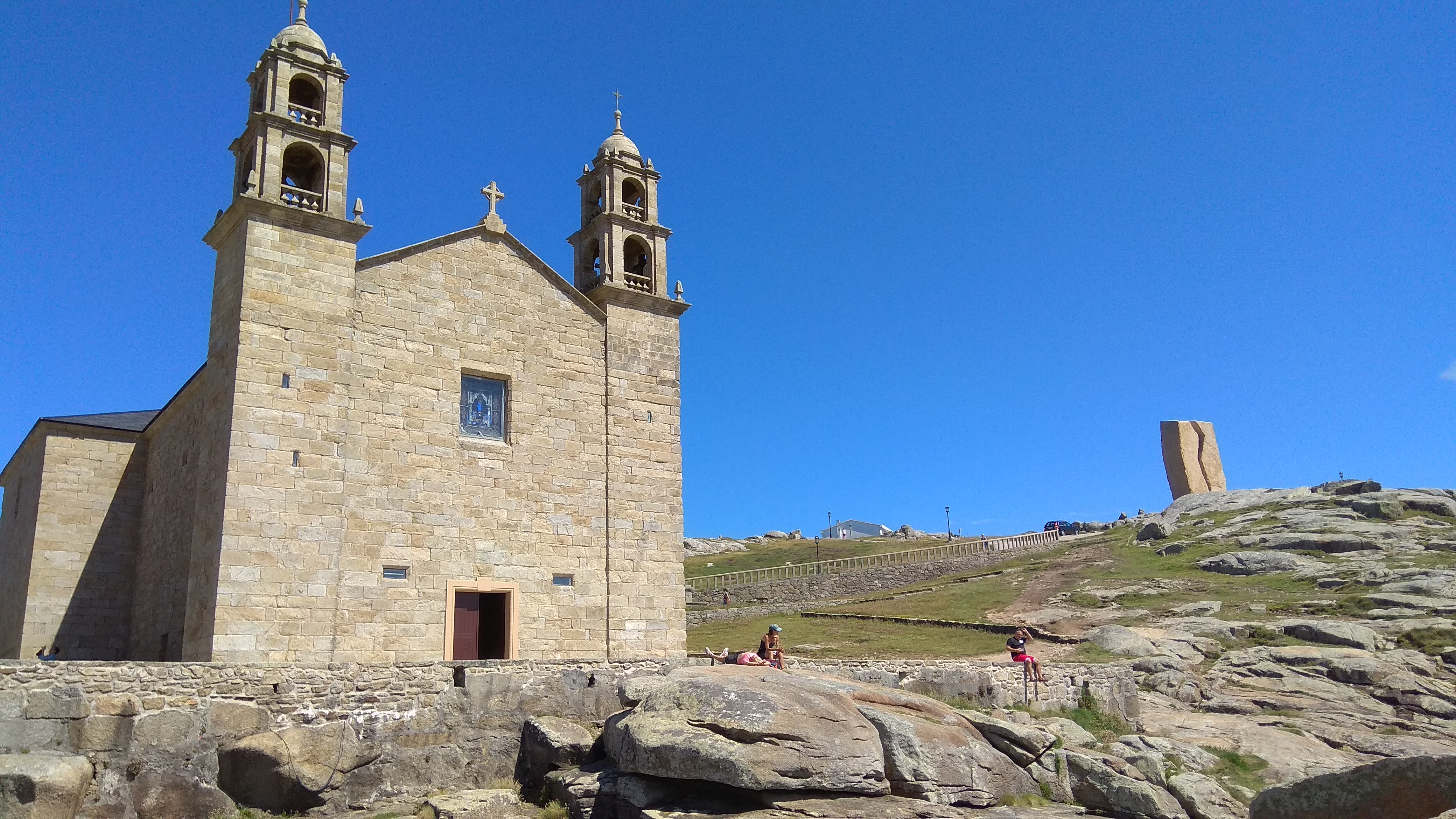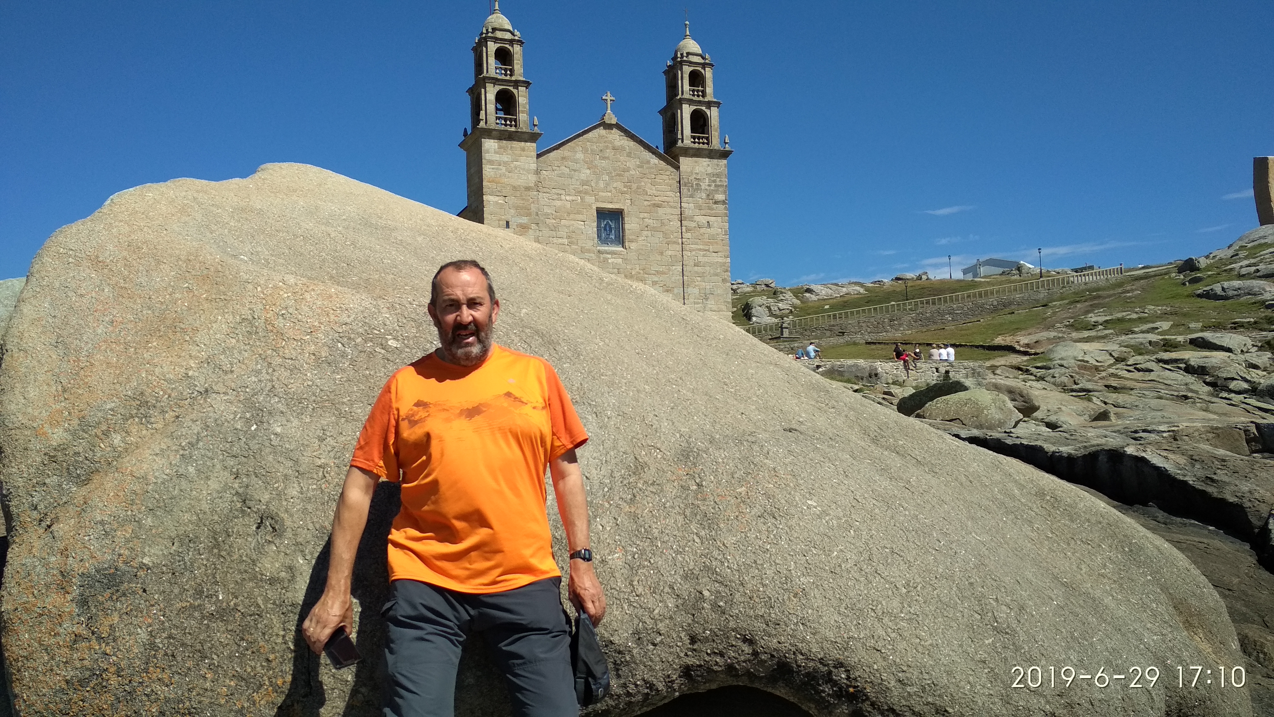 Mientras tanto Ángel ha llegado en taxi a Lires y ha comenzado su media etapa hacia Muxía. Como no hace mucho calor y el día está nublado avanza bastante bien a pesar de las pequeñas cuestas. La cuesta abajo desde el parque eólico (el punto más alto de la etapa) hasta Muxía, es lo que más acusan las rodillas y las plantas de los pies.
