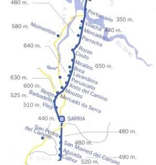 Población de mas de 12000 habitantes que sorprende por sus dimensiones en una zona donde sólo hay pequeñas aldeas. Sarria fue un importante burgo medieval y hoy es, principalmente, un núcleo de servicios. Al poco de cruzar el río, encontramos una gran escalinata por la que los peregrinos, accedemos al barrio alto (casco antiguo) de la villa, y llegamos a la calle Mayor. A la altura del castillo parte hacia la derecha otra calle que nos sitúa ya junto al convento de los Padres Mercedarios, quienes hasta hace poco ofrecían cobijo al peregrino.