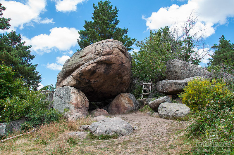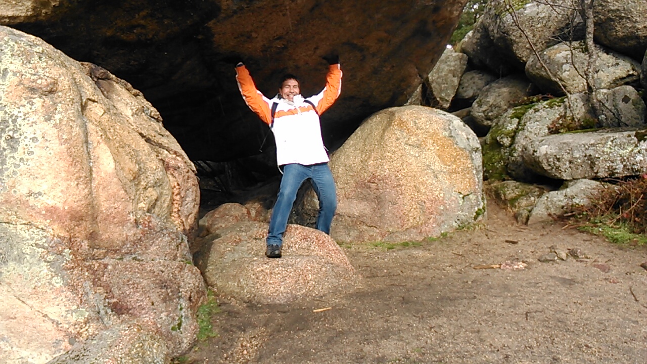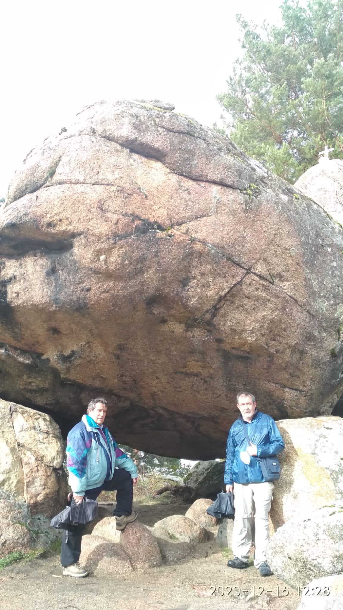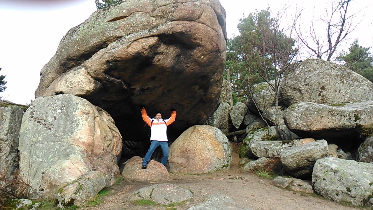Regresamos bajo la lluvia hacia la pequeña carretera asfaltada y unos quince minutos después nos resguardamos bajo las grandes piedras de la Cueva del Monje. Inmediatamente deja de llover.