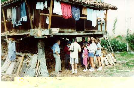 por allí; en una de las callejas, bajo un hórreo, había un viejo tallando unas